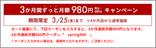こちらのキャンペーンは、3か月間ずっと月額980円で利用できます。